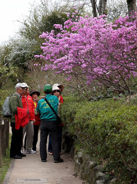 ラストに全員で記念集合写真 満開のカンヒザクラ